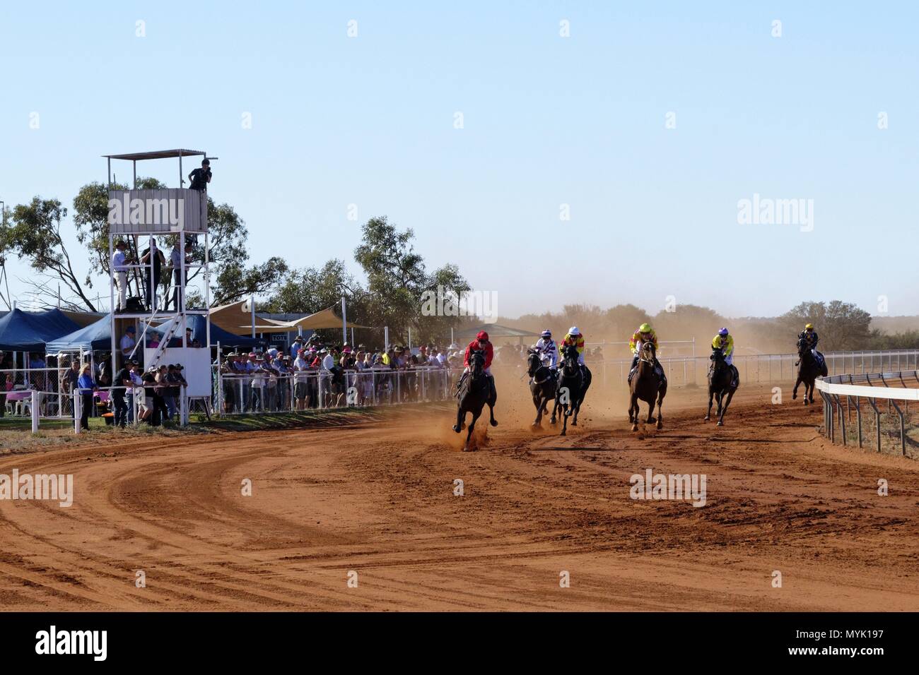 Men And Teenager 16 17 Horse Racing On Dirt Track Stock Photo